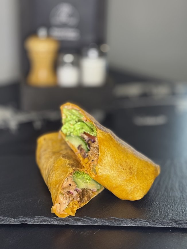 Pflanzliche Pulled Beef-Alternative, Salat, homemade Burgersauce, Zwiebel, Tomaten, & Gurke